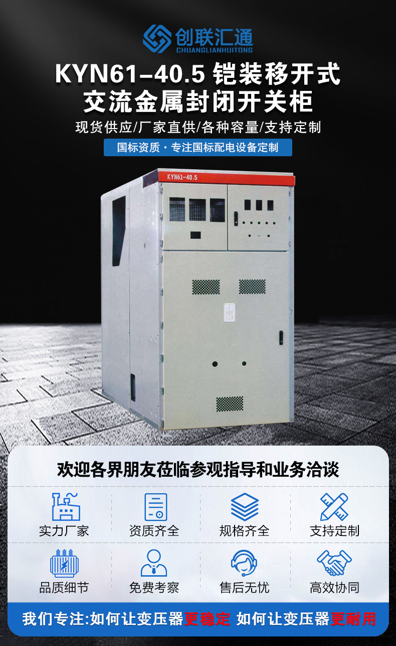 KYN61-40.5型鎧裝移開式交流金屬封閉開關柜系三相 交流50Hz,額定電壓40.5kV的戶內成套配電裝置。作為發電廠、變電站及工礦企